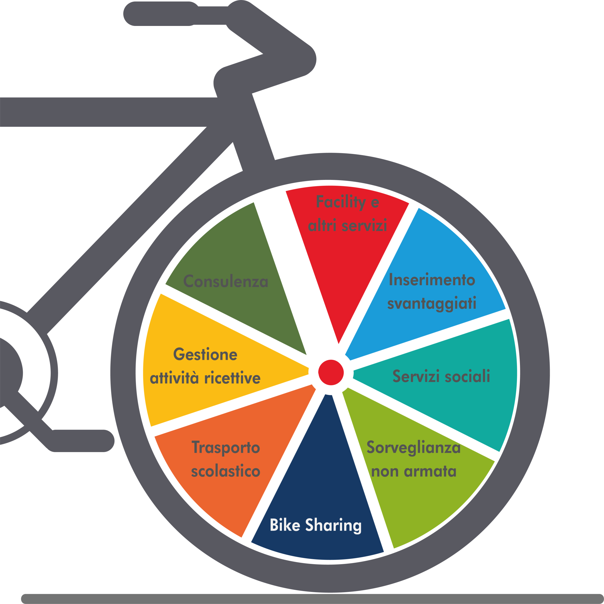 Attività Facility e altri serviziPulizie civili, industriali ed ospedaliereProgettazione, gestione e manutenzione impianti industriali e civiliServizi scolastici ausiliariRistorazione collettiva e servizi collegatiTrasporto pastiFacchinaggio e movimentazionePortierato, custodia e sorveglianza non armata Inserimento soggetti svantaggiatiServizi di facility management svolti da soggetti svantaggiati ai sensi della L. 381/91 Servizi socialiAssistenza al trasporto scolasticoAssistenza al trasporto disabiliSupporto al personale docente ed educativoServizi pre e post scuolaLaboratori creativi ludico-educativi Sorveglianza non armataServizi di accoglienzaPortierato Gestione bike sharingGestione servizio di sharingGestione parco mezzi Trasporto scolasticoTrasporto scolasticoAssistenza su scuolabus Gestione attività ricettiveGestione stabilimenti balneariGestione ostelliPortierato, custodia e sorveglianza non armataAccoglienza museale ConsulenzaProgettazione e redazione relazioni tecniche per gare d’appaltoProgettazione e realizzazione servizi di comunicazioneRicerca e sviluppo, sostenibilità e innovazione